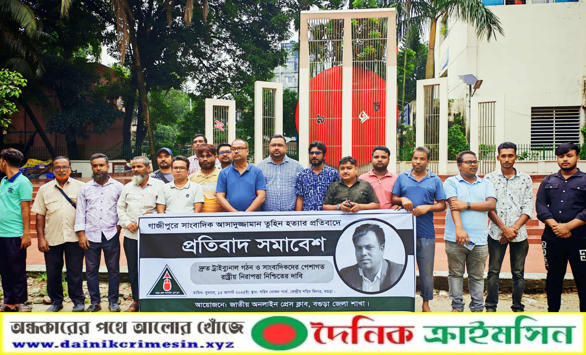 জাতীয় অনলাইন প্রেস ক্লাব বগুড়া জেলা শাখার সভাপতি মাকছুদ আলম হাওলাদারের সভাপতিত্বে ও ভারপ্রাপ্ত সাধারণ সম্পাদক নজরুল ইসলাম দয়ার সঞ্চালনায় প্রতিবাদ সমাবেশে বক্তব্য রাখেন বগুড়া প্রেস ক্লাবের কার্যনির্বাহী সদস্য ও দৈনিক ইনকিলাব আঞ্চলিক প্রধান মহসিন আলী রাজু, বগুড়া প্রেস ক্লাবের কোষাধ্যক্ষ তানভীর আলম রিমন,