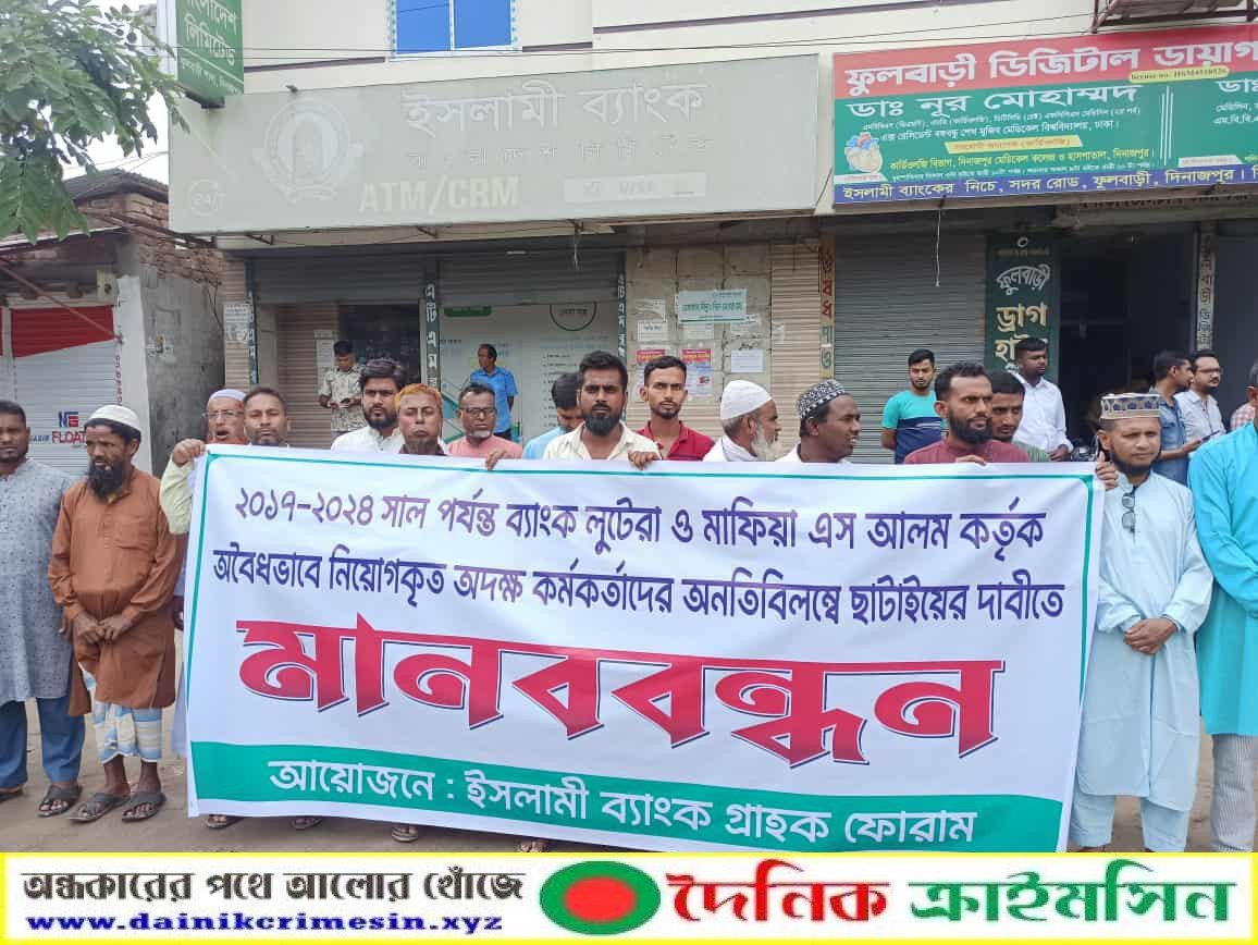 দিনাজপুরের ফুলবাড়ীতে চার দফা দাবিতে মানববন্ধন ও বিক্ষোভ সমাবেশ করেছে ইসলামী ব্যাংক গ্রাহক ফোরাম ও বৈষম্য বিরোধী চাকুরী প্রত্যাশী পরিষদ।