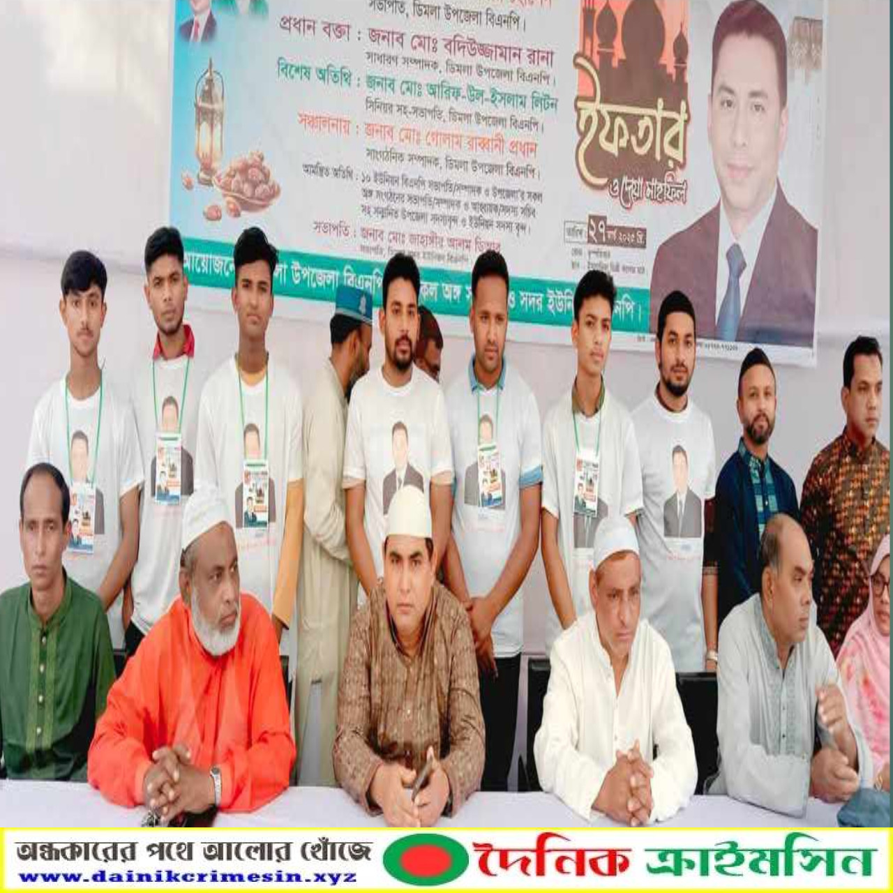 আজ বৃহস্পতিবার (২৭ মার্চ) বিকাল ৫টায় ইসলামিয়া ডিগ্রী কলেজ মাঠে দোয়া ও ইফতার মাহফিল অনুষ্ঠিত হয়েছে। দোয়া ও ইফতার মাহফিল অনুষ্ঠানে সভাপতিত্ব করেন ডিমলা উপজেলা সদর ইউনিয়ন বিএনপির সভাপতি জাহাঙ্গীর আলম ডিয়ার। উপজেলা বিএনপি'র সাংগঠনিক সম্পাদক গোলাম রাব্বানী প্রধানের সঞ্চালনায় প্রধান অতিথি হিসেবে উপস্থিত ছিলেন, ডিমলা উপজেলা বিএনপি'র সভাপতি অধ্যক্ষ মনোয়ার হোসেন। প্রধান বক্তা প্রধান বক্তা হিসেবে উপস্থিত ছিলেন, উপজেলা বিএনপি'র সাধারণ সম্পাদক বদিউজ্জামান রানা। বিশেষ অতিথি হিসেবে উপস্থিত ছিলেন, উপজেলা বিএনপি'র সিনিয়র সহসভাপতি আরিফুল ইসলাম লিটন , আমন্ত্রিত অতিথি হিসেবে উপস্থিত ছিলেন, ১০ ইউনিয়নের বিএনপি'র সকল অঙ্গ সংগঠনের সভাপতি, সাধারণ সম্পাদকসহ বিএনপির সকল অঙ্গ সংগঠনের নেতাকর্মীবৃন্দ।