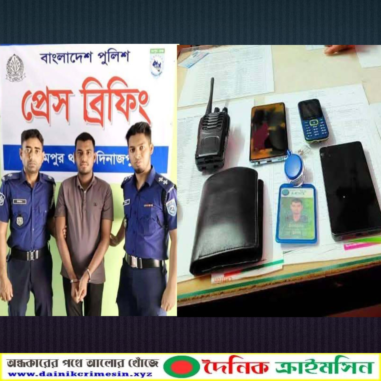 দিনাজপুরের বিরামপুর উপজেলায় ছিনতাইয়ের উদ্দেশ্যে ওত পেতে থাকা ব্যক্তি সেনাবাহিনীর আইডি কার্ড ও ওয়াকিটকিসহ ১জন কে গ্রেফতার করে পুলিশ।
