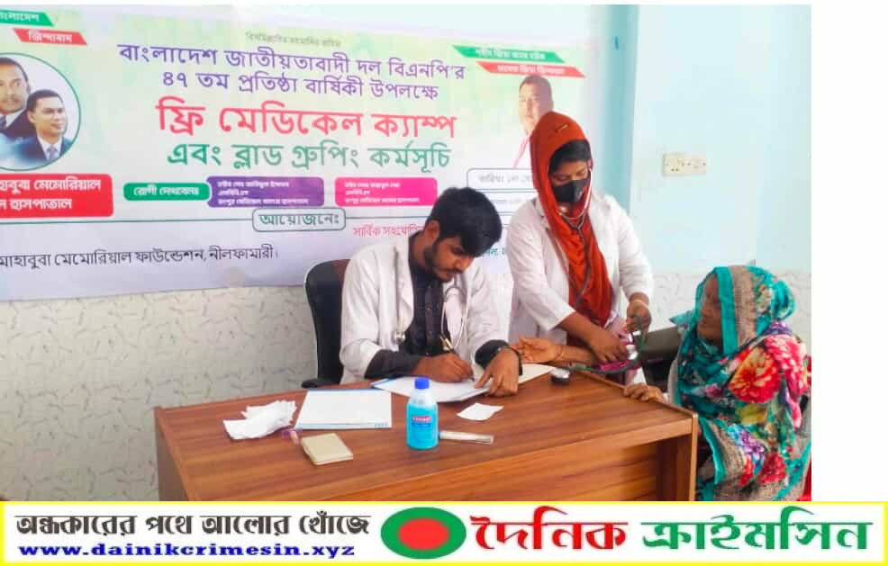 বাংলাদেশ জাতীয়তাবাদী দল (বিএনপি)-এর ৪৭তম প্রতিষ্ঠাবার্ষিকী উপলক্ষে নীলফামারীতে আয়োজন করা হয়েছে ফ্রি মেডিকেল ক্যাম্প ও রক্তের গ্রুপ নির্ণয় কর্মসূচি। সোমবার (১ সেপ্টেম্বর) সদর উপজেলার গোড়গ্রাম ইউনিয়নের মাহাবুবা মেমোরিয়াল জেনারেল হাসপাতালে ঢাকা কলেজ ছাত্রদলের প্রতিষ্ঠাতা সভাপতি কাবেরুল ইসলাম লিটনের উদ্যোগে এ কর্মসূচি অনুষ্ঠিত হয়।