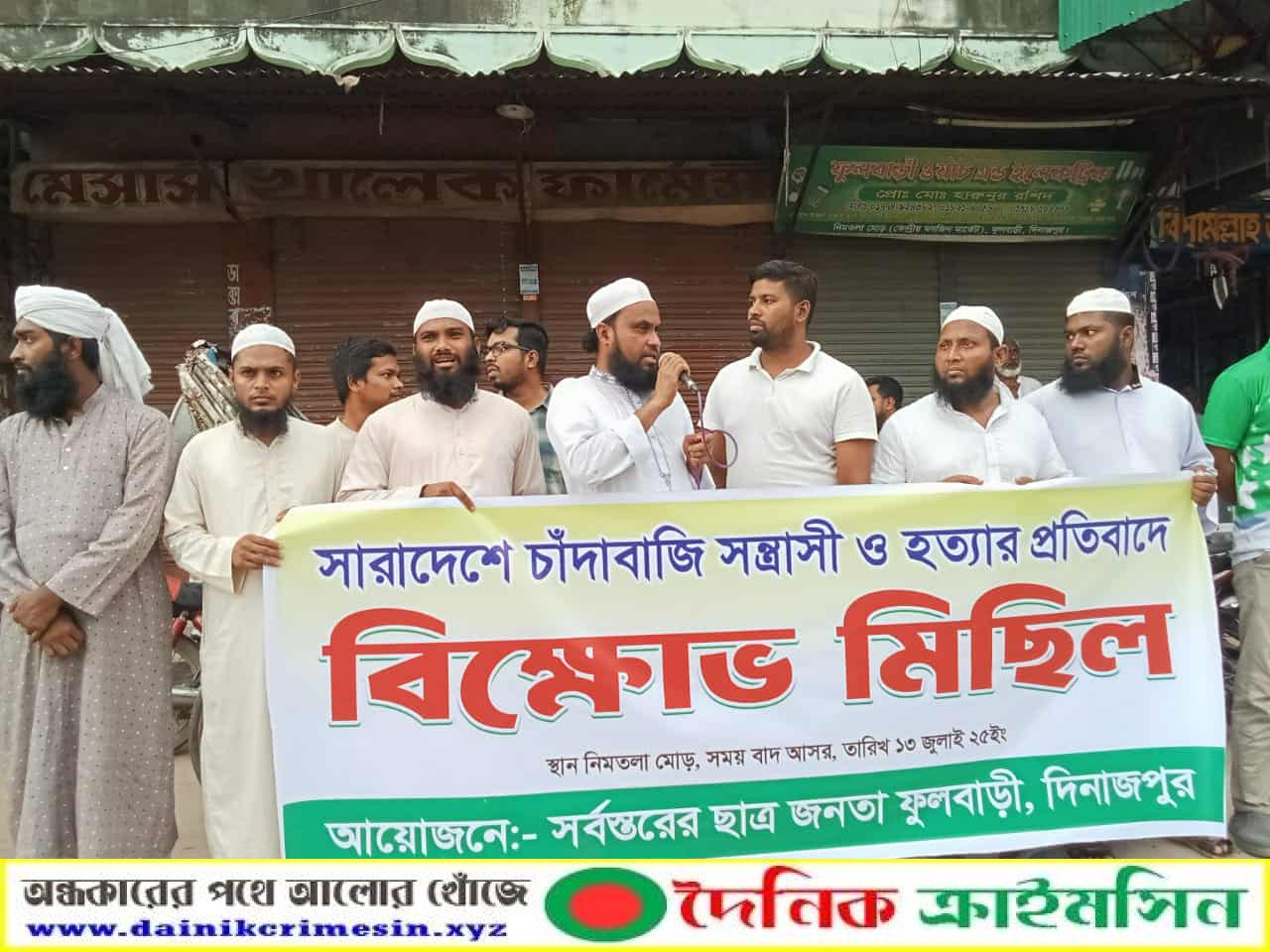 দিনাজপুরের ফুলবাড়ীতে সারা দেশে চাঁদাবাজি সন্ত্রাসী ও হত্যাকান্ডের প্রতিবাদে বিক্ষোভ মিছিল করেছে সর্বস্তরের ছাত্র-জনতা।