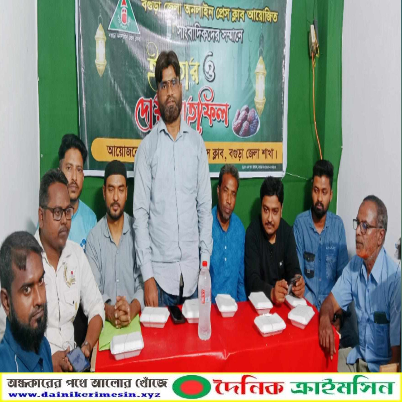 শনিবার বগুড়া জেলা অনলাইন প্রেস ক্লাবের সভাপতি মাকছুদ আলম হাওলাদারের সভাপতিত্বে ও সাংগঠনিক সম্পাদক নজরুল ইসলাম দয়ার সঞ্চালনায় ইফতারপূর্ব সভায় বক্তব্য রাখেন সংগঠনের সম্পাদক মন্ডলীর সদস্য এসএম দৌলত।