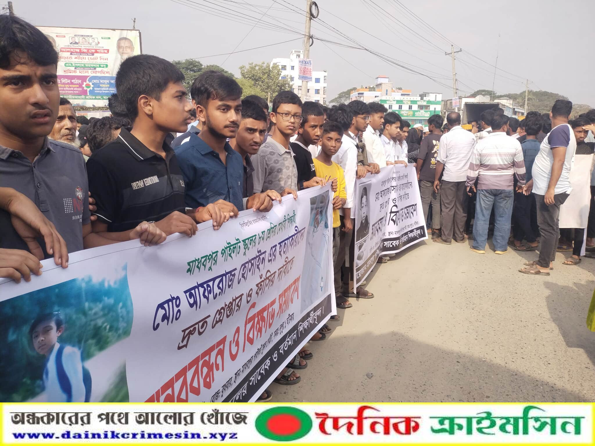 হবিগঞ্জের মাধবপুর পাইলট উচ্চ বিদ্যালয়ের অষ্টম শ্রেণির ছাত্র আফরোজ হোসাইন হত্যায় জড়িতদের গ্রেফতার ও বিচারের দাবিতে মানববন্ধন অনুষ্ঠিত হয়েছে।