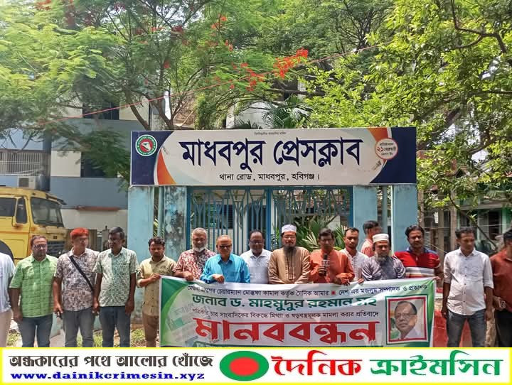 মাধবপুরে দৈনিক আমার দেশ সম্পাদক ও প্রকাশক ড.মাহমুদুর রহমান ও ৪ সাংবাদিকের বিরুদ্ধে মিথ্যা মামলা প্রত্যাহারের দাবিতে মানববন্ধন ও প্রতিবাদ সমাবেশ অনুষ্টিত হয়েছে।