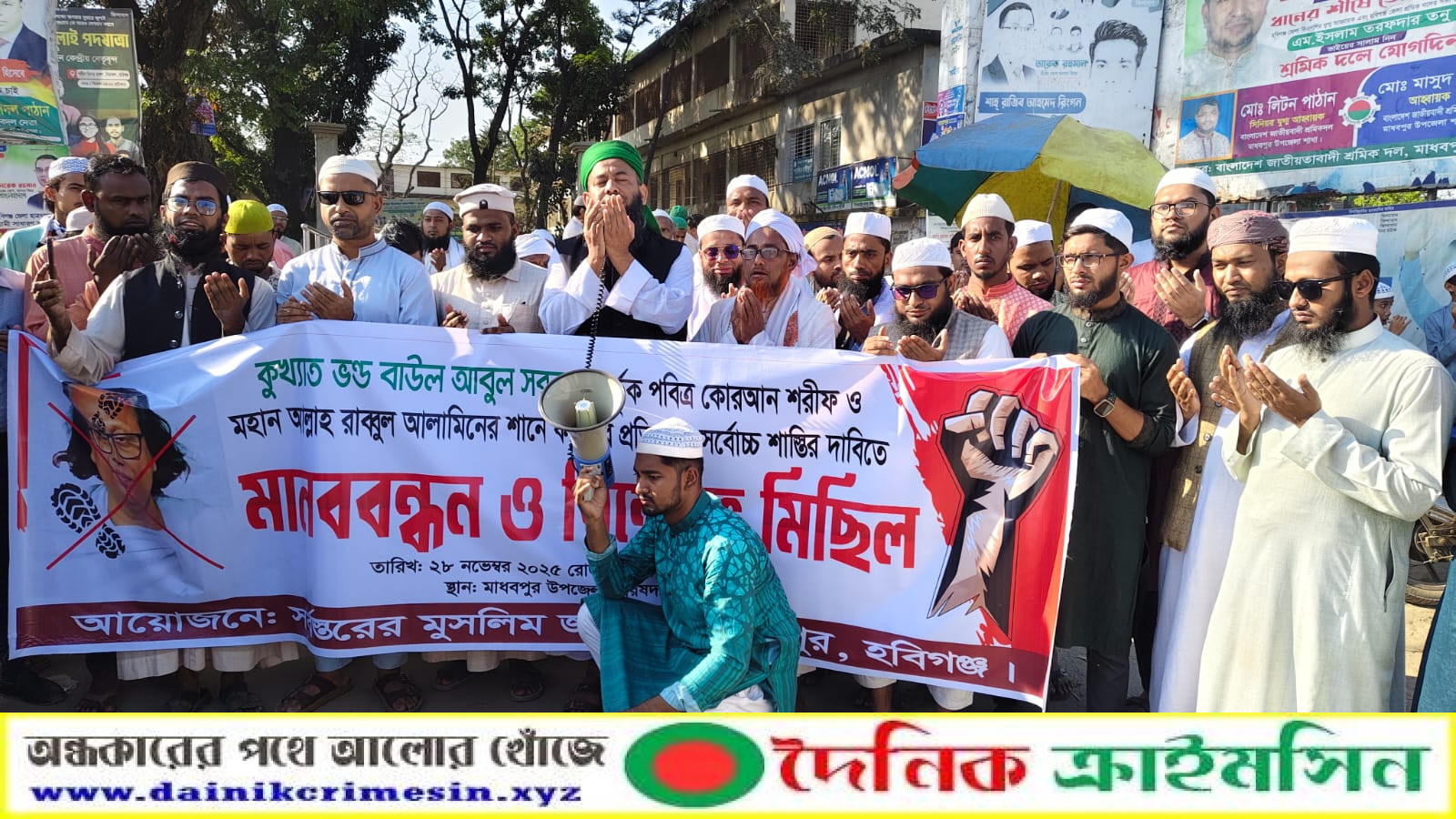 মাধবপুরে বাউল শিল্পী আবুল সরকারের শাস্তির দাবিতে বি/ক্ষো/ভ মিছিল ও মানববন্ধন