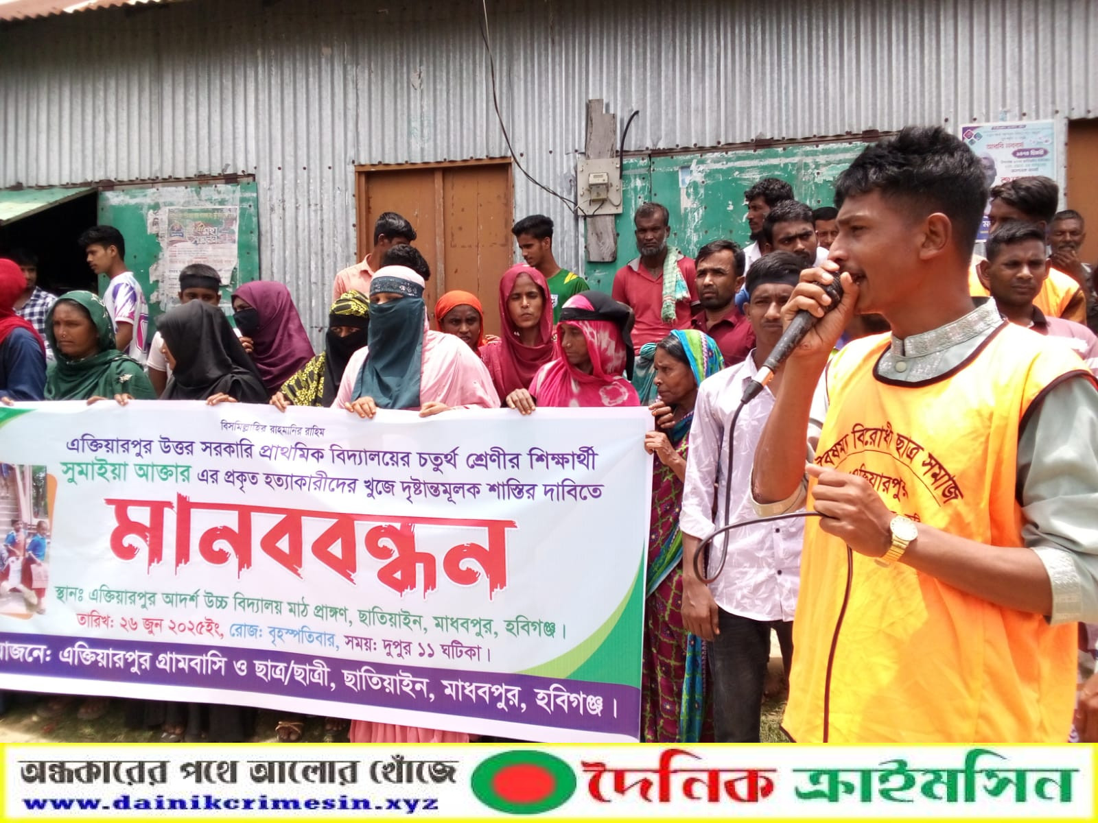 হবিগঞ্জের মাধবপুরে এক্তিয়ারপুর উত্তর সরকারি প্রাথমিক বিদ্যালয়ের ৪র্থ শ্রেণীর শিক্ষার্থী সুমাইয়া আক্তারের প্রকৃত হত্যাকারীদের দৃষ্টান্তমূলক শাস্তির দাবিতে মানবন্ধন অনুষ্ঠিত হয়েছে।