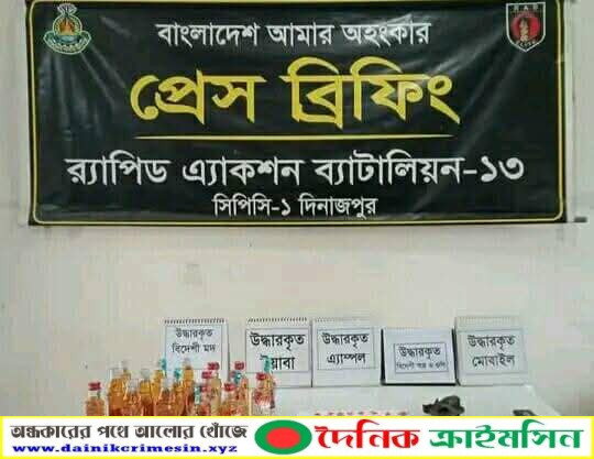 র্যাবের চলমান এসকল অভিযানের ধারাবাহিকতায় র্যাব-১৩, ক্রাইম প্রিভেনশন কোম্পানী-১, দিনাজপুরের একটি চৌকস আভিযানিক দল গোপন সংবাদের ভিত্তিতে ১৯ জুলাই, ২৫ তারিখ সময় ০৭.৪০ মিনিটে দিনাজপুর জেলার কোতয়ালী থানাধীন ১০নং কমলপুর ইউনিয়নের দক্ষিণ দাইনুর কনজকুড়ী গ্রামস্থ মোঃ আনোয়ার হোসেনের ছেলে জনৈক মোঃ সাগর বাবু (২১), বসত বাড়ির উত্তর পার্শ্বের শয়ন কক্ষের ভিতর অভিযান পরিচালনা করে পলাতক আসামী মোঃ সাগর বাবু এর ফেলে যাওয়া ০১টি বিদেশী রিভলবার ও ০৫ রাউন্ড তাজা গুলি সহ ১৮৫ পিস ইয়াবা ট্যাবলেট, ১৭ বোতল বিদেশী মদ এবং ০৩ পিস নেশাজাতীয় এ্যাম্পুল ইনজেকশন উদ্ধার করে।
