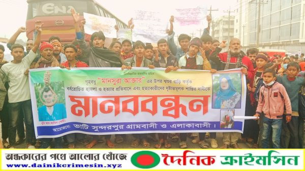 ক্রাইমসিন সংবাদ : মাধবপুরে গৃহবধূ মানসুরা আক্তারের মৃত্যু কে হত্যা দাবি করে তার স্বজন ও এলাকাবাসী বুধবার ঢাকা সিলেট মহাসড়ক অবরোধ ও মানববন্ধন করে দোষিদের শাস্তি দাবি করেছে। মানববন্ধন চলাকালে